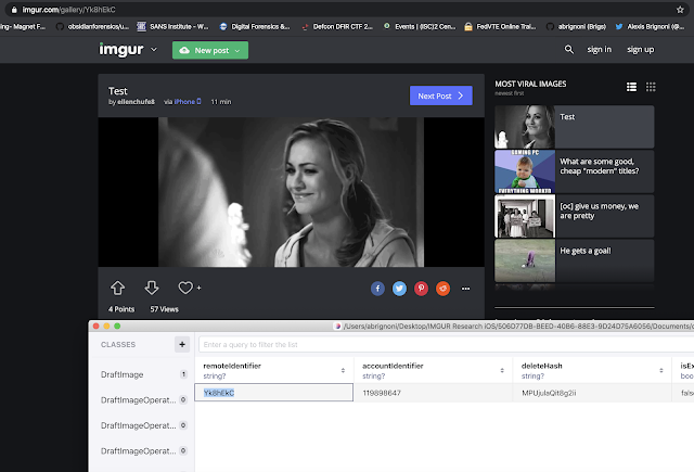 The Imgur iOS app is one of the growing number of software development project that have moved from using SQLite databases to the Real database NoSQL data storage type. For details on how to approach Realm databases see my previous post on the topic here: https://abrignoni.blogspot.com/2019/11/realm-database-storage-primer-for.html